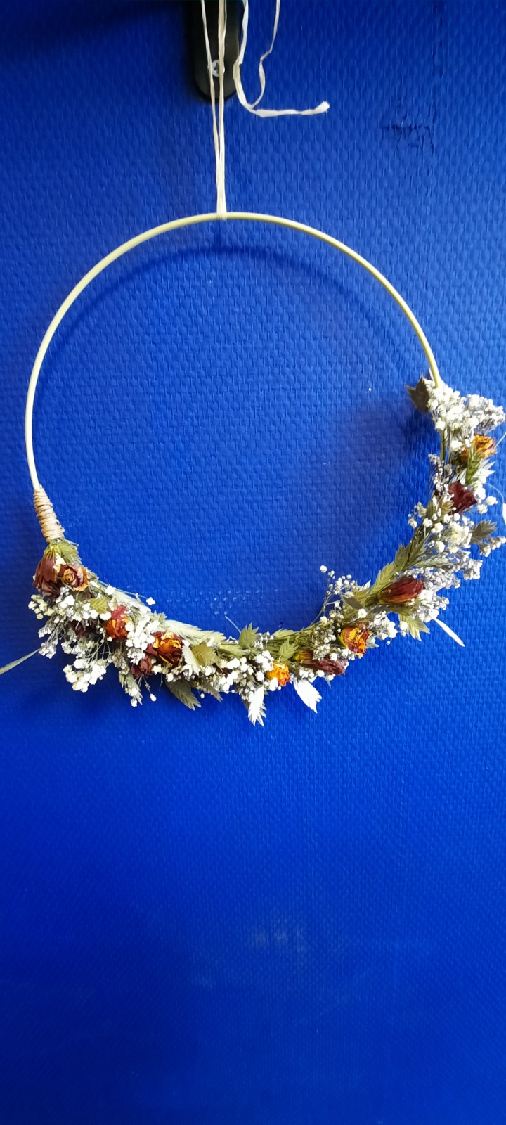 A suspendre ou à porter, la couronne de fleurs séchées sait convaincre. Nous vous aidons à créer votre propre couronne du choix des fleurs jusqu’au finitions minutieuses.